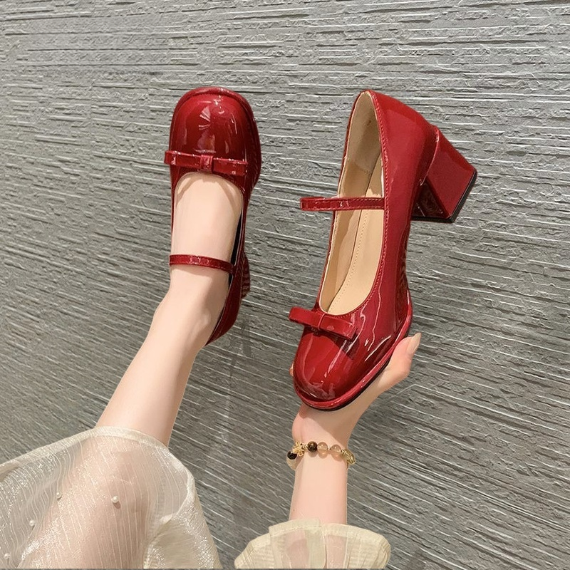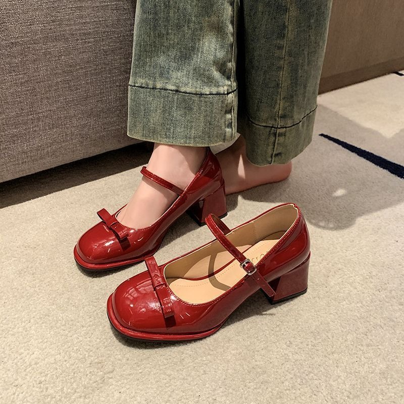 Red Mary Jane Shoes High Heels Glossy Leather Korean School Shoes For Women With Block Heels