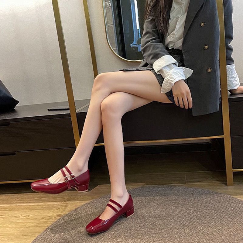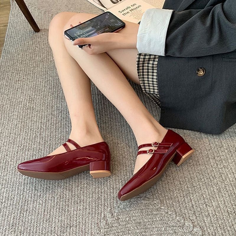 Wine red mary jane shoes high heels glossy size 35-41 Korean school shoes for women 1inch